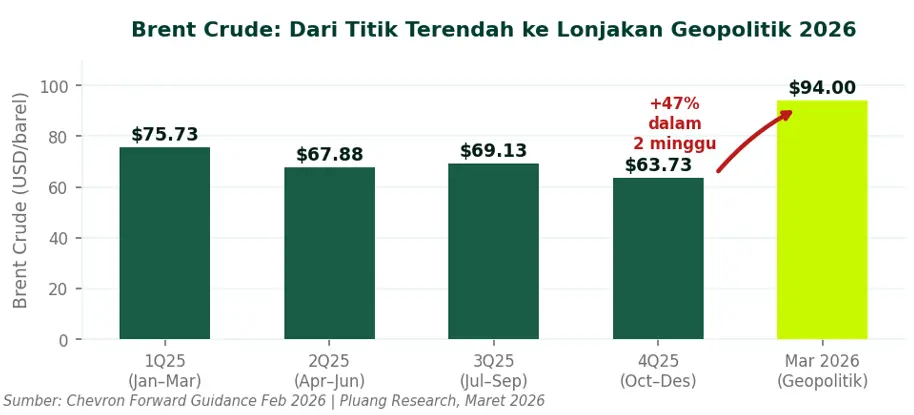 Gambar 1 — Harga minyak Brent menyentuh titik terendah $63.73/barel di 4Q25 sebelum melonjak hampir 50% ke $94/barel dalam dua minggu akibat eskalasi geopolitik. Sumber: Chevron Forward Guidance Feb 2026.