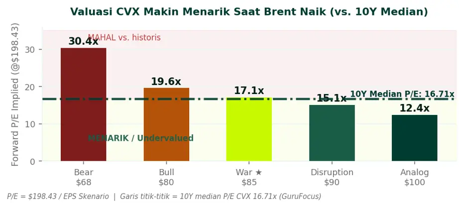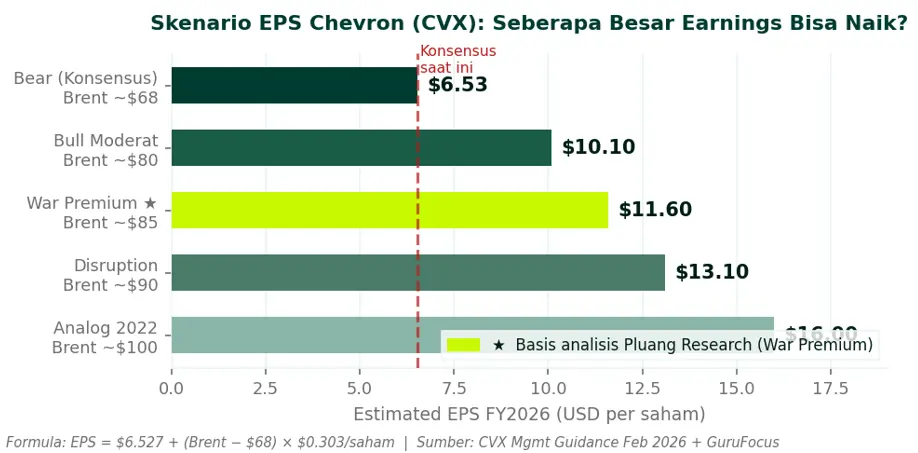 Metodologi: Proyeksi EPS dibangun menggunakan sensitivitas resmi manajemen CVX ($600M A/T earnings per $1 perubahan Brent, full year) dikombinasikan dengan konsensus analis baseline GuruFocus ($6.527 FY2026). Analisis ini bersifat skenario—bukan proyeksi point estimate. Semua angka dalam USD kecuali disebutkan lain. Artikel ditulis untuk tujuan edukasi dan peningkatan literasi keuangan—bukan rekomendasi investasi.