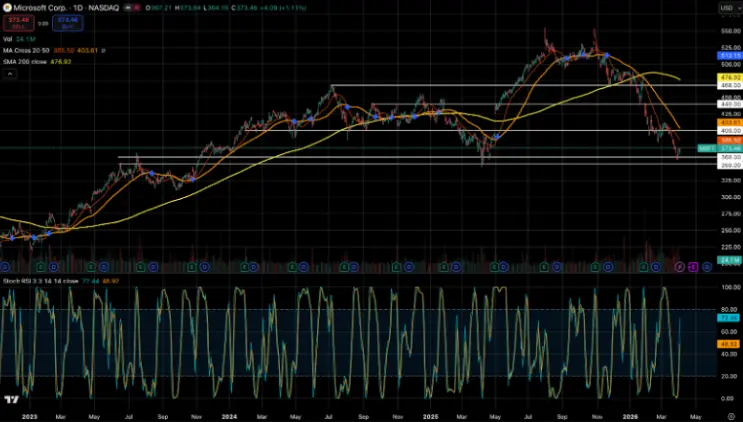 MSFT saat ini sedang berada dalam tekanan jual yang kuat (strong bearish) karena harga telah menembus ke bawah seluruh indikator rata-rata pergerakan utama, yaitu MA 20, MA 50, dan bahkan SMA 200 di level $476.92. Kondisi ini mengonfirmasi bahwa tren jangka menengah hingga panjang sedang terancam. Level resisten terdekat yang cukup krusial berada di kisaran $400.00 (area breakdown sebelumnya), sementara perlu diwaspadai adanya potensi pola Dead Cross karena MA 50 ($403.61) dan MA 20 ($385.50) berada jauh di bawah SMA 200.