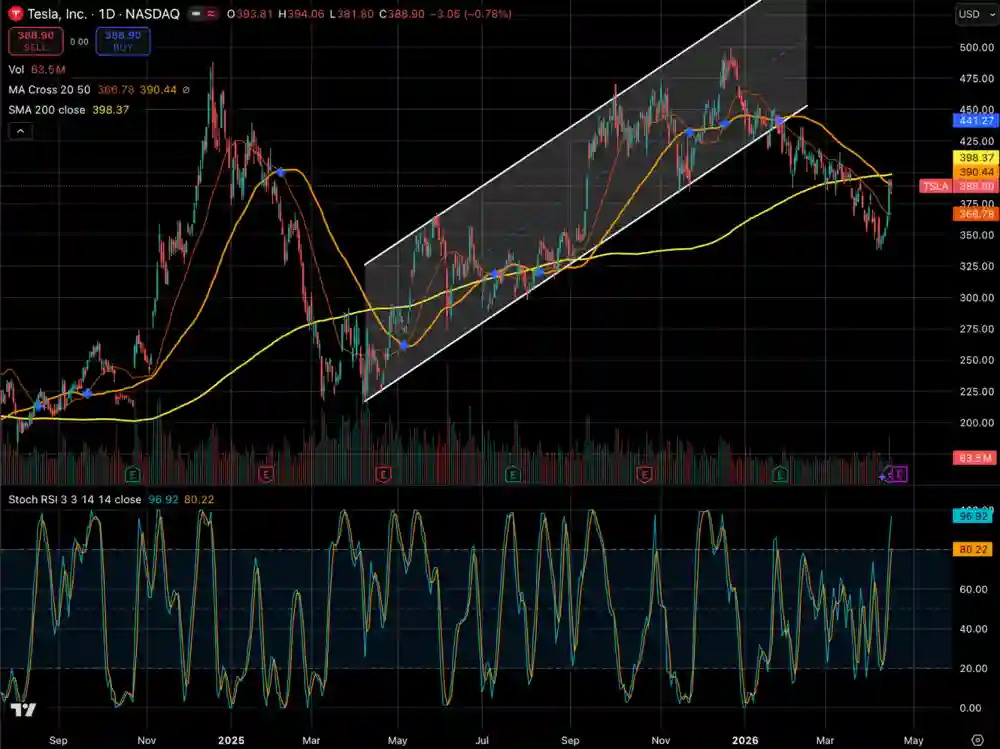TSLA saat ini tengah berupaya membangun momentum pemulihan (technical rebound) setelah sebelumnya mengalami koreksi tajam yang mematahkan pola Ascending Channel (garis tren putih) ke arah bawah. Harga penutupan terakhir berada di level $388.90, di mana harga berhasil merangkak naik dan mengamankan pijakan di atas support dinamis minor MA 20 ($366.78). Momentum pemulihan jangka pendek ini terkonfirmasi kuat oleh indikator Stochastic RSI yang melesat tajam memasuki area sangat jenuh beli (overbought), dengan garis biru (96.92) berada mantap di atas garis oranye (80.22).