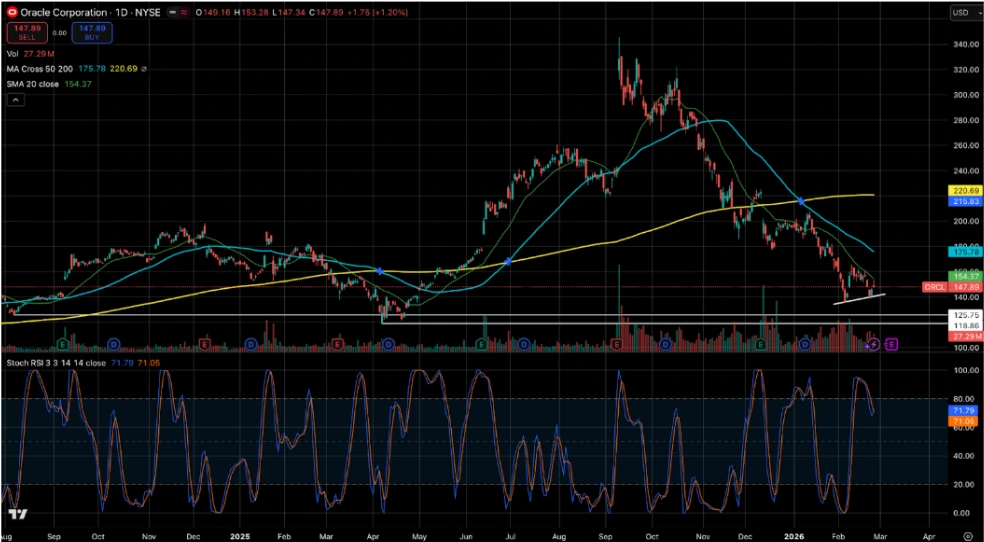 ORCL saat ini sedang berupaya membangun momentum pemulihan (rebound) jangka pendek setelah mengalami fase penurunan (downtrend) yang cukup agresif. Harga penutupan terakhir berada di level $147.89, dan saat ini sedang bersiap untuk menguji resisten dinamis terdekatnya, yakni MA 20 ($154.37). Meskipun tren utama masih tertekan, indikator Stochastic RSI memperlihatkan momentum perlawanan yang positif (berada di kisaran level 71) dan bergerak mendaki mendekati area jenuh beli, mengindikasikan bahwa pembeli mulai kembali masuk ke pasar dalam jangka pendek.