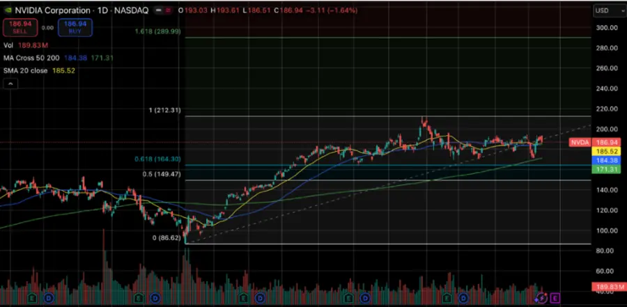 Secara struktur teknikal, NVDA membentuk pola Higher Lows yang solid. Area pertahanan krusial (Major Support) jika terjadi koreksi lanjutan adalah level Fibonacci Retracement 0.618 (Golden Ratio) di harga $164.30. Level ini menjadi benteng terakhir yang menjaga tren bullish jangka panjang, mengingat posisinya yang berdekatan dengan MA 200 ($171.31).