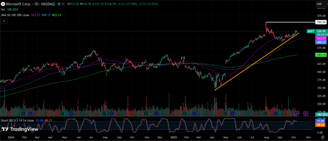 Microsoft ($MSFT) saat ini berada dalam tren bullish yang cukup kuat, dengan harga bergerak di atas rata-rata pergerakan 50, 100, dan 200 harinya. Kondisi ini menunjukkan momentum bullish yang berkelanjutan. Kini, MSFT diperdagangkan pada level $526 dan memiliki level resisten pertama di $555. Beberapa indikator seperti RSI, Stochastic & Oscillators menunjukkan sentimen netral cenderung bullish sehingga cenderung menguntungkan saham MSFT dalam jangka pendek.