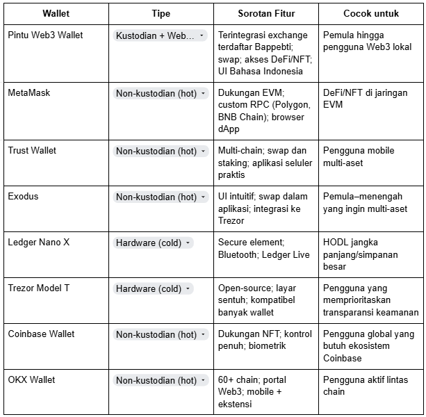 Di bawah ini adalah ringkasan beberapa opsi wallet kripto yang populer di Indonesia—baik untuk akses Web3, pengalaman pemula, maupun penyimpanan jangka panjang.