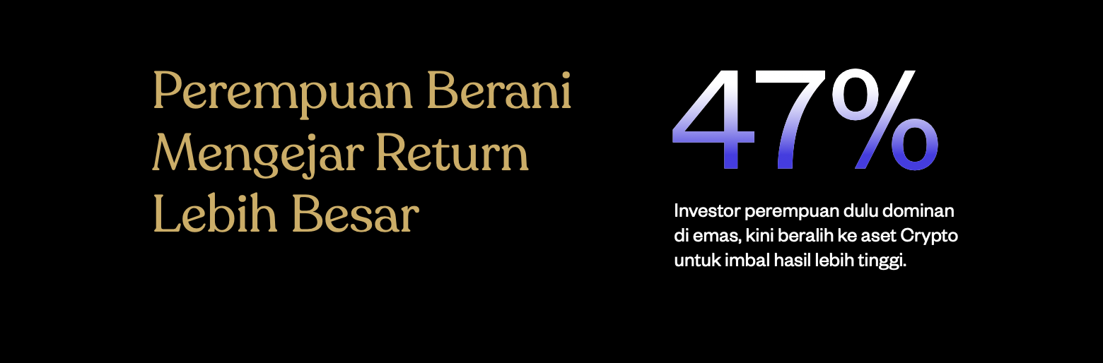 Kesadaran finansial di kalangan perempuan juga meningkat pesat. Data internal Pluang menunjukkan bahwa 25% investor saat ini adalah perempuan, tumbuh 22% dibandingkan tahun sebelumnya. Bahkan, 47% dari mereka kini berani berinvestasi di aset crypto, beralih dari dominasi emas sebagai aset konservatif. Tren ini menunjukkan bahwa perempuan Indonesia semakin aktif membangun kemandirian finansial dan berani mengambil keputusan investasi berisiko lebih tinggi untuk hasil yang optimal.