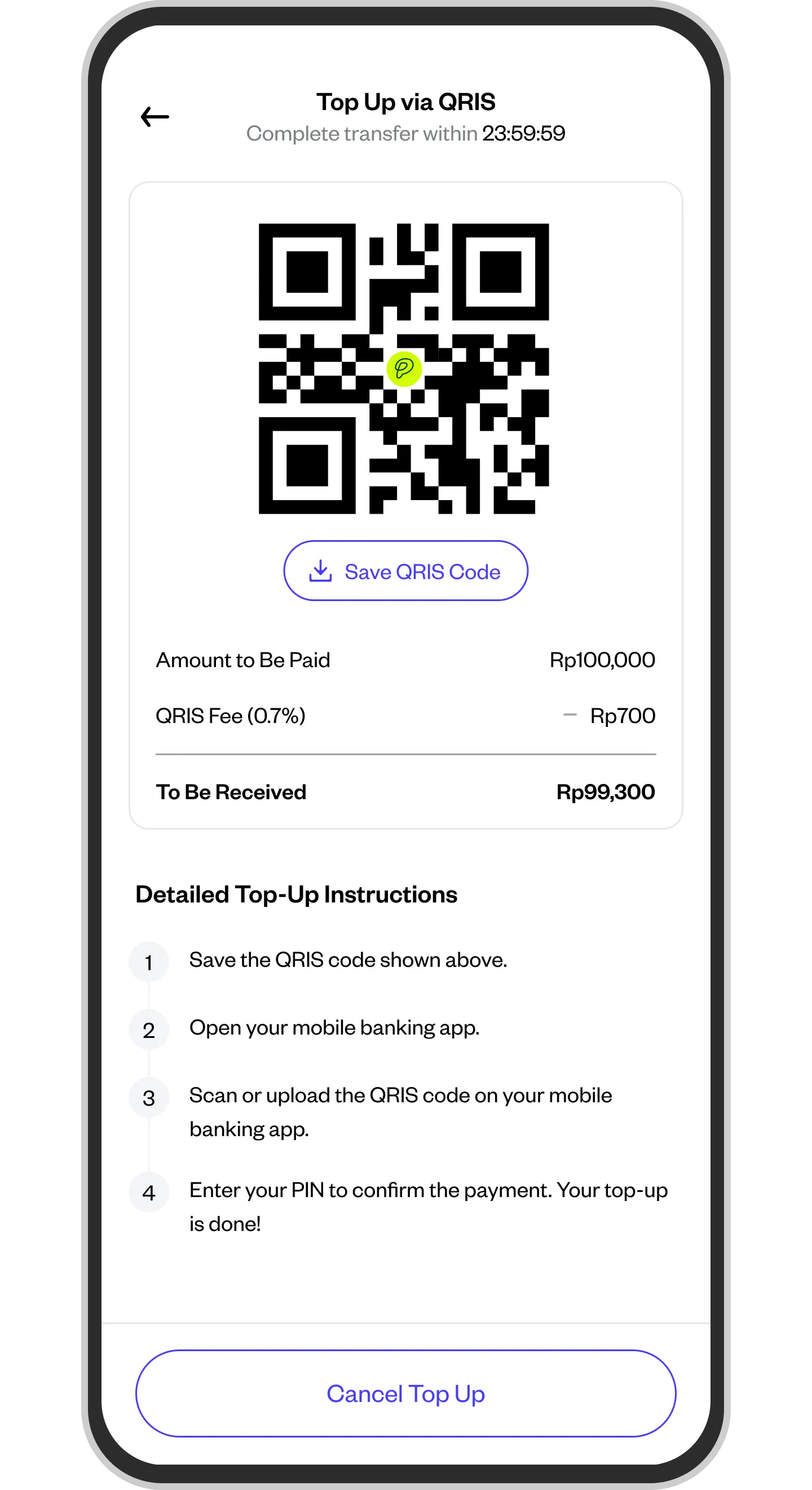 Harap diketahui bahwa batas maksimal transaksi melalui QRIS adalah sebesar Rp10,000,000 dan terdapat biaya QRIS sebesar 0.7% dari nominal Top up yang dimasukkan dan akan mengurangi saldo yang diterima.