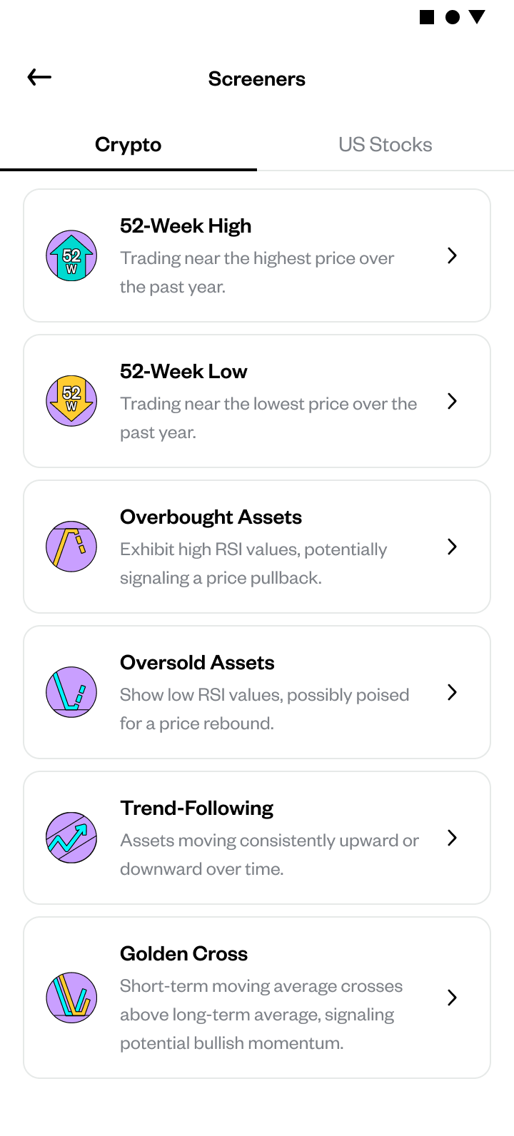 Pada halaman Screeners, temukan berbagai daftar yang sudah terkurasi seperti 52-Week High atau Overbought Assets pada aset Crypto dan Saham AS.